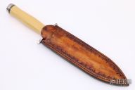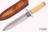 This Dagger by David John Handmade Knives features a hand rub satin finished double edged blade with a very nice hamon, .262" blade stock and 1.541" blade depth, hidden tang construction. The handle has a 303 stainless steel guard and butt with a ivory paper micarta and black and stainless steel spacers. Comes with a very nicely hand tooled brown leather sheath. New from maker.