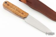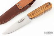 This drop point utility by Pharaos Knives features a satin finished blade with a full tang construction. .139" Blade Stock. 1.248" Blade Depth. The handle features re/blue G10 liners complemented by Zebra wood scales and a mosaic pin. Includes a brown leather sheath. New from maker.