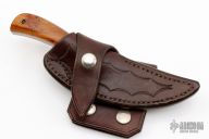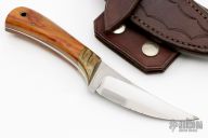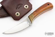 This up swept Skinner by Sid Jirik features a mirror polished blade with a notched thumbrest and a tapered tang construction. .191" Blade Stock. 1.038" Blade Depth. The handle features brass bolster complemented by wood scales. Includes a brown leather sheath. Scratches are visible on the blade otherwise the knife is in excellent condition.
