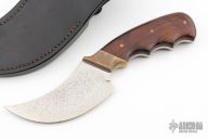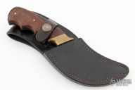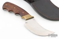 This Skinner by Jim Moran features a mirror polished blade with a full tang construction. .149" Blade Depth. 1.62" Blade Depth. The handle features brass bolsters complemented by wood scales. Includes a black leather sheath. Heavy spotting is visible on the bade otherwise the knife is in excellent condition.