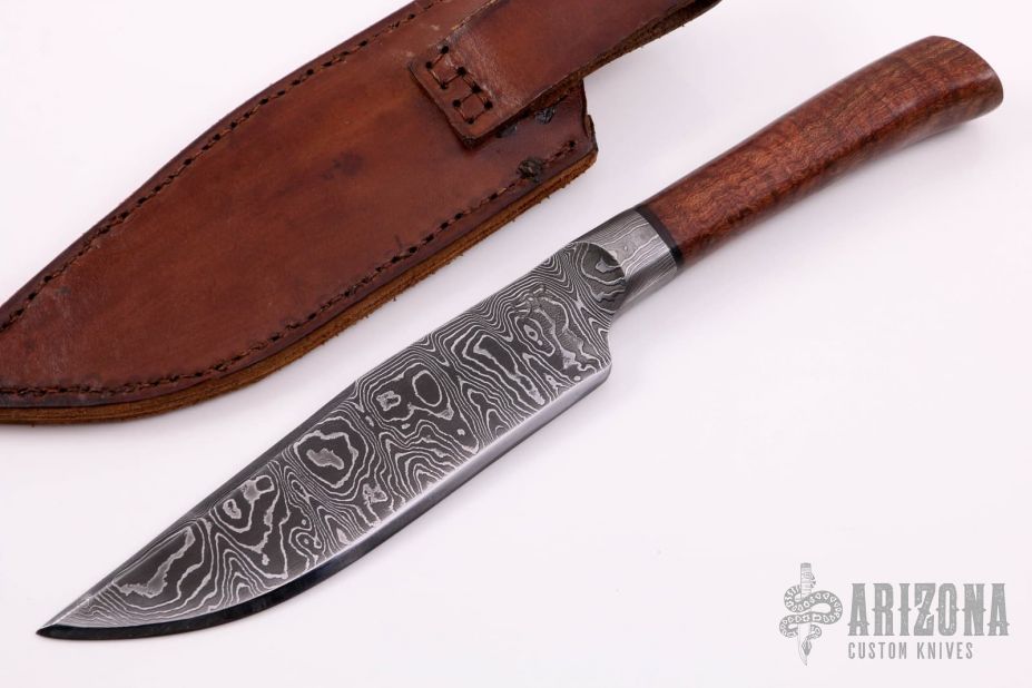 This Camp knife by Dakota Richey features a 100 layer Ladder Pattern Damascus blade with integral bolsters, .256" blade stock and 1.674" blade depth, hidden tang construction with a Babinga wood grip. Comes with a hand tooled brown leather sheath. New from maker.