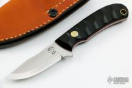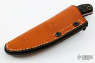 This Explorer by Tom Krein features a satin finished scandi ground blade with notched thumbrest, .099" blade stock and .819" blade depth. The handle is comprised of African blackwood scales with brass pin and a lanyard tube over red liners and full tang construction. Includes Kydex sheath with TekLok. New from maker.