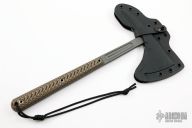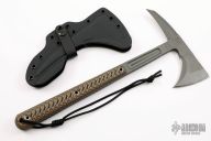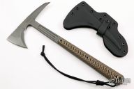 The Kestrel Feather is a lightweight and more compact version of the venerable 18" Eagle Talon. This multi-roll tomahawk was designed to be fast and light, it comes in at just 19oz, and 13.25" long. It offers full tang construction made from 1/4" 80CRV2 carbon steel that has a Tungsten Cerekote finish for corrosion resistance and wear. This is a heavy use tool, the full tang construction absorbs the punishment while the hardened striking surface on the head delivers it back without chipping or shattering. The permanently attached G10 handle scales offer a contoured 3D texture that works great both wet and dry without being overly aggressive. The 3 inch forward edge is razor sharp and that is combined with a 3" distal tapered spike that can be used for digging, shattering tempered glass, penetrating sheet metal, it can be used to hack through concrete and wood, to breaking chains and hardened padlocks. One tool, many tasks is the idea behind our tomahawks, We want you to never leave home without being prepared, whether that's an emergency situation or exploring the next vista to watch a killer sunset. The Kestrel Feather tomahawk is a very capable, lightweight hiking and camping tool. From chopping wood, to camp site clearing, food preparation, the tomahawk is an incredible cutting tool for a lot of tasks. It is also an important piece of kit for first responder's that require a tool for breach and extraction work. The 13.25" length won't impede movement yet can make quick work of anything that it comes in contact with! Comes with original trail pack, kydex sheath and papers. New from maker.