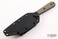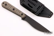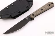 The Silence Slim by Bastinelli Knives features a black blade with a notched thumbrest and a full tang construction. .160" Blade Stock. 1.069" Blade Depth. The handle features green micarta scales. Includes a kydex sheath with a tech-lock. New from maker.