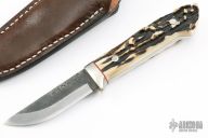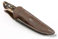 This sheath knife by Shosui Takeda features a Stainless Clad Aogami Super Steel (NAS) blade, .154" blade stock and .818" blade depth, full tang construction. The handle has nickel silver guard, and a 2-piece stag grip. Comes with a brown leather sheath. Excellent Condition.