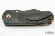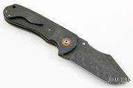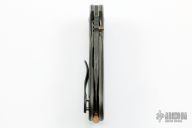 This Dark Tangent features a clip point Damascus blade with a single copper thumbstud. The handle features zirconium bolsters with a matching tip up pocket clip along with carbon fiber scales and copper ascents. Nice detent, lockup and blade seating. Includes a padded zippered case. Excellent Condition.
