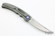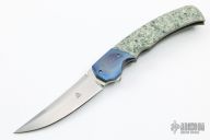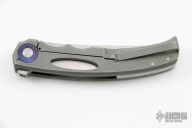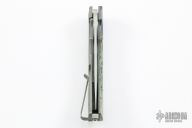 This Mini Persian from Jason Clark features a clip point blade with swedge and notched flipper. The handle is comprised of a Super Conductor bolster complemented by a money micarta scale over a titanium liner on the "A" side and a bead blasted titanium lockside and tip up pocket clip. Super conductor pivot collar. Stainless steel backspacer. Great blade seating, detent and lock up. Includes C.O.A and leather slip sheath. Excellent Condition.