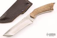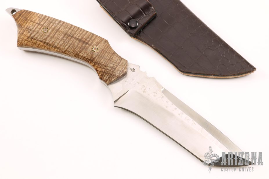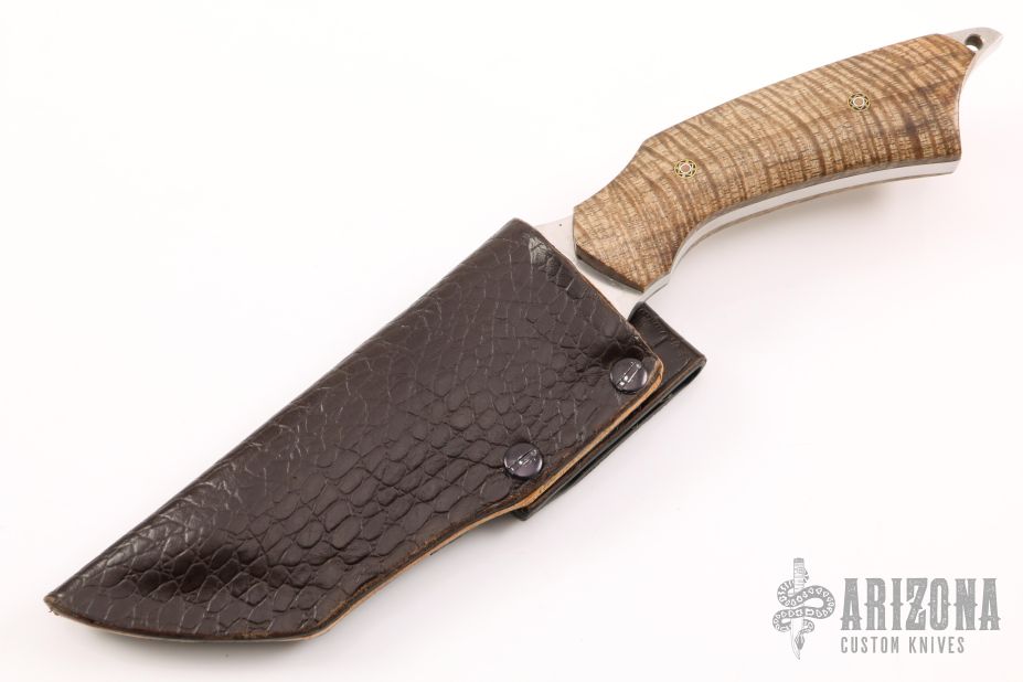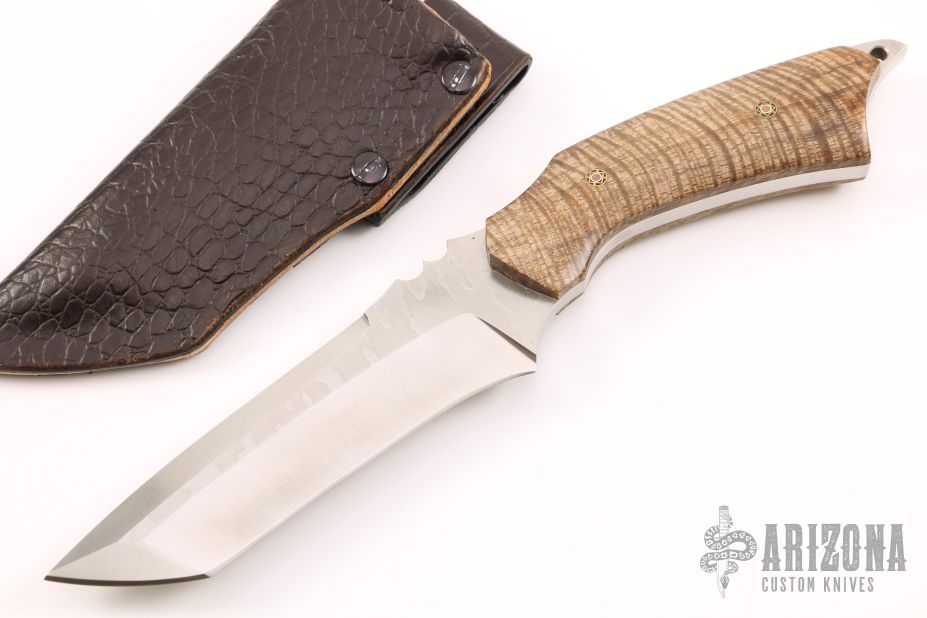 This knife by Rick Barrett features a tanto blade with satin grinds and acid etched flats, .259" blade stock and 1.809" blade depth, full tang construction. The handle has curly koa wood scales with mosaic pins and a lanyard hole. Comes with leather lined and covered kydex sheath with belt loop and a zippered case. Excellent condition.