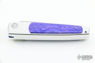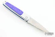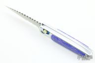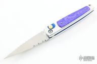 This customized auto by Adams International Knife works features a satin finished blade with partial serrations and a file worked blade spine. The handle is composed of polished aluminum with Charoite Stone overlay on both sides. Includes the original box. Excellent Condition.