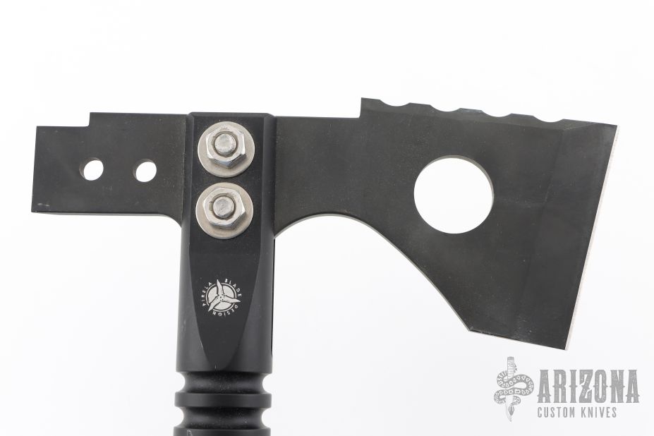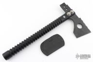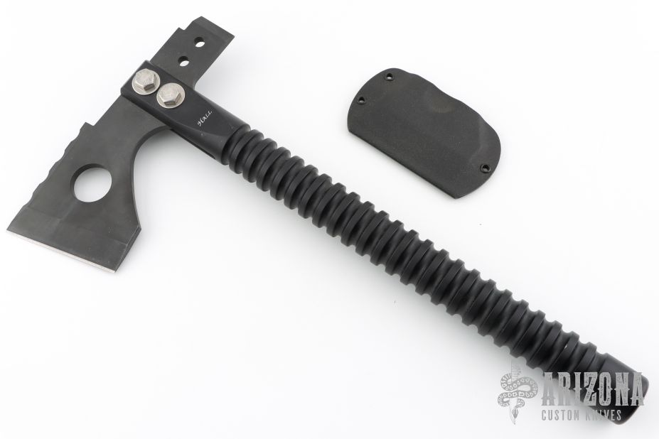 This L Max (Light Weight Modular Axe) by Jeff Hall and Joel Pirela is a custom hand ground axe that features a black finished blade, .247" blade stock and 3.125" blade depth. The handle is black aluminum. Comes with kydex sheath. Light scuffs are visible otherwise the axe is in excellent condition.