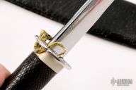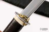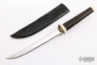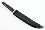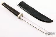 This Tanto by Norman Bardsley features a mirror polished blade with a visible temper line, .266" blade stock and 1.125" blade depth, hidden tang construction. The handle has a carved tsuba with a dragon, white corian butt and collar, snake skin grip. Comes with an ostrich leg skin leather sheath. Excellent condition.