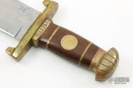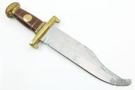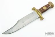 This Iron Mistress Bowie by John Nelson Cooper features a satin finished clip point blade with sharpened top edge, .248" blade stock and 2.352" blade depth, hidden tang construction. The handle has a brass guard, brown canvas micarta grip with brass spacers and escutcheon and a fileworked brass butt cap. Comes with a metal case. Has some oxidation and light pitting, has some scratches, otherwise good condition.