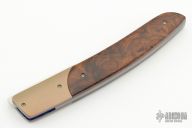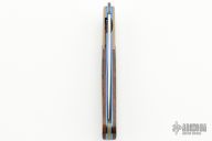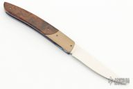 This front flipping linerlock by John Wilmot features a hand rub satin finished blade with notched front flipper. The handle has bead blasted and anodized titanium bolsters, Arizona desert ironwood scales, anodized titanium liners and backspacer. Nice detent, lockup and blade seating. Comes with a zippered case and COA #567. Excellent condition.