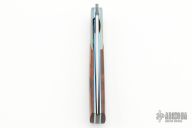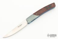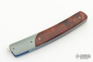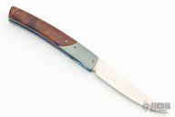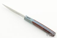 This front flipping linerlock by John Wilmot features a hand rub satin finished blade with notched front flipper. The handle has bead blasted and anodized titanium bolsters, Taaibos scales, anodized titanium liners and backspacer. Nice detent, lockup and blade seating. Comes with a zippered case and COA #624. Has a naturally occurring crack in the front scale, otherwise excellent condition.