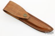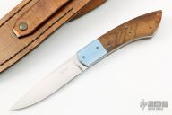 This hunter by Christo Knives features a hand rub satin finished blade with .127" blade stock and .773" blade depth, full tang construction. The handle has anodized titanium bolsters and liners with wild olivewood scales. Comes with a brown leather sheath and COA dated 1/9/2001. Excellent condition.