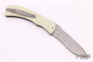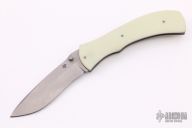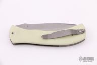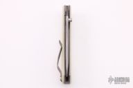 This linerlock by Aaron Frederick features a tumbled blade with notched thumbrest and single checkered thumbstud. The handle has moonglow scales, blasted titanium liners and matching tip up clip, bead blasted titanium backspacer. Nice detent, lockup and blade seating. Has a few light scuffs, excellent Condition.