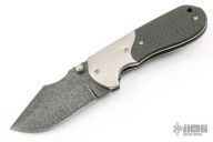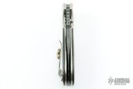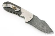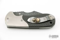 This Tangent features a Burch/Muller Damascus clip point blade with notched thumbrest and single thumbstud. The handle has orange peel finished titanium bolsters and liners, lightning strike carbon fiber scales, and a matching Damascus backspacer, tip up Steel Flame skull clip. Comes with a leather zippered case. Originally from the 2014 Blade Show. Excellent condition.