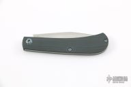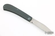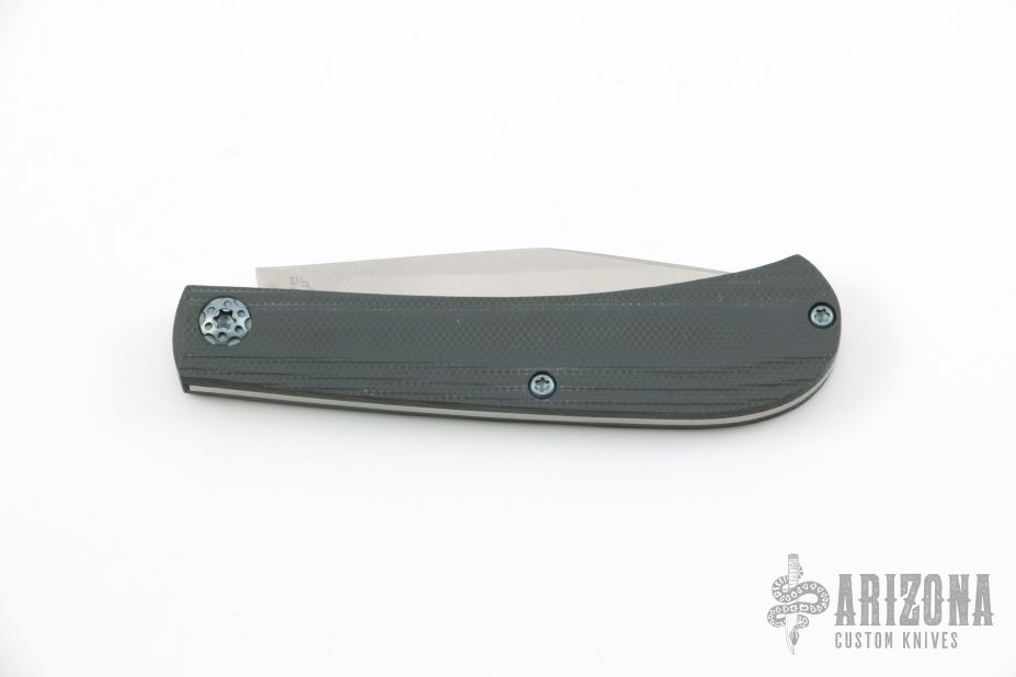 This Gatortooth slipjoint by Gatorbud and Alphahunter features a blasted clip point AEB-L blade with false top edge, has half-stop, flush in all positions. The handle has grey G-10 covers , blasted stainless steel spring and titanium hardware. Comes with a leather pouch. Excellent condition.