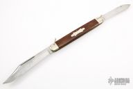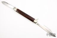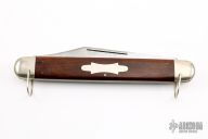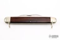 This knife by the New York Knife Company (which later became Schrade) features two enormous blades with nail nicks. Some staining on the blades and a couple nicks in the blade edge. The handle has nickel silver bolsters, cocobolo covers with nickel silver escutcheon, brass liners and steel springs. Has some scratches and patina, otherwise good condition for its age. This would have been made in the early 1900s.