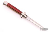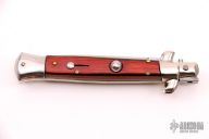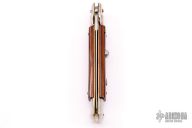 This swivel bolster auto by AB Italy features a tumbled and polished blade with a false top edge. The handle has stainless stain bolsters and butt, wood scales and brass liners. Strong opening. Has safety. Has a few light scratches, otherwise excellent condition.