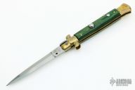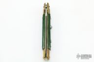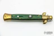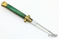 This swivel bolster auto by AB Italy features a tumbled and polished blade with a false top edge. The handle has brass bolsters and butt, wood scales and brass liners. Strong opening. Has safety. Has a few light scratches, otherwise excellent condition.