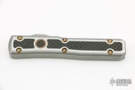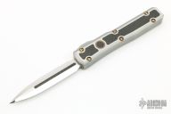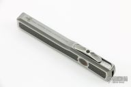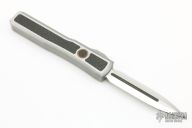 This Ultratech by Marfione Custom Knives features a mirror polished double edged blade with Lightning Strike Carbon Fiber inlays. The handle has a 416 stainless steel frame with lightning strike carbon fiber and copper inlays, stainless steel thumbslide with lightning strike carbon fiber inlay, ringed bronzed titanium hardware. Dated 02/2019 and s/n 006. Comes with original box, zippered case and COA. Excellent condition.