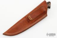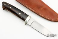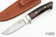 This knife by Tom Mayo features a hand rub satin finished drop point blade, .188" blade stock and 1.062" blade depth, full tang construction. The handle has a nickel silver guard and wood scales. Comes with a brown leather sheath. Excellent condition.