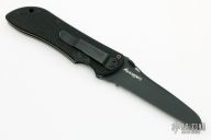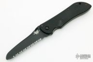 This Rescue Stryker by Benchmade features a black fully serrated blade with thumbdisc and notched thumbrest. The handle has black G-10 scales, titanium liners and a black stainless steel tip down clip. Comes with original box and papers. Excellent condition.