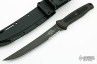 This Black Marlin Fillet Knife by Microtech Knives features a black finished partially serrated upswept blade with .127" blade stock and 1.197" blade depth. The handle is comprised of black anodized aluminum with non slip inserts over hidden tang construction. Lanyard hole in pommel. Includes injection molded sheath with TekLok. Has a few light scuffs, otherwise excellent condition. RARE