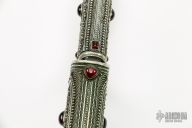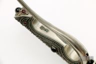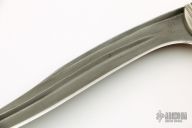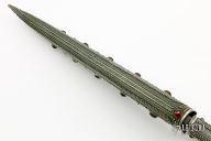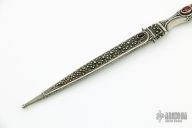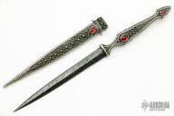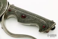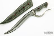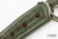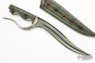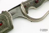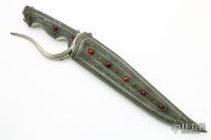 This collaboration by Zaza Revishvili and Master Smith Al Pendray features a recurve blade with very deep fullers and a partially sharpened top edge, made from Al Pendray's Wootz Steel, .467" blade stock and 1.750" blade depth, hidden tang construction. The handle is comprised of detailed silver filigree with red garnets done by Zaza Revishvili. The sheath has matching filigree with red garnets. Excellent condition. Stunning work.