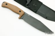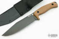 This SFS by Akeron knives is a Tony Lopes design, it has a black PVD clip point blade with notched thumbrest and tang, .198" blade stock and 1.725" blade depth, full tang construction with flat dark earth G-10 scales and a lanyard hole. Comes with a kydex and black leather sheath and original box. New from maker at the 2019 Blade Show.