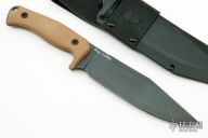 This SFS by Akeron knives is a Tony Lopes design, it has a black PVD clip point blade with notched thumbrest and tang, .198" blade stock and 1.725" blade depth, full tang construction with flat dark earth G-10 scales and a lanyard hole. Comes with a kydex and black leather sheath and original box. New from maker at the 2019 Blade Show.