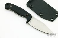 This Eklipse by Akeron features a stonewashed clip point blade with notched thumbrest and tang, .119" blade stock and 1.056" blade depth, full tang construction with black G-10 scales and a lanyard hole. Comes with a kydex sheath and original box. New from maker at the 2019 Blade Show.