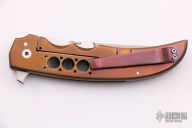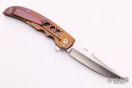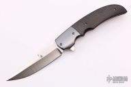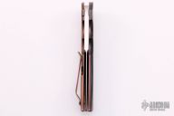 This Persian Flipper by Jason Clark features a satin finished blade with a false top edge and notched flipper. The handle has a dovetailed zirconium bolster, carbon fiber scales, anodized titanium liner and lockside with matching tip up clip, a satin finished stainless steel backspacer. Rides on IKBS, nice detent, lockup and blade seating. Comes with a zippered case and COA dated 8/13/15. Excellent condition.