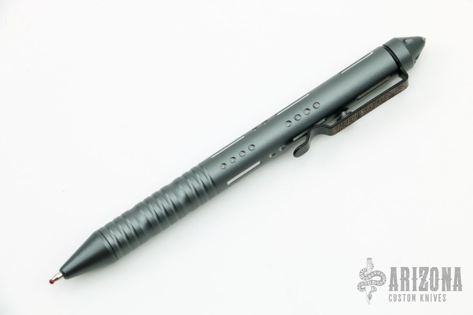 This Tac-Bolt pen by Kraken Tactical features a Cerakoted aluminum body with laser engraving, stainless steel clip. Take a Parker/Schmit style refill. Has a tungsten carbide defensive glass breaker on the end. Comes with original box. New from maker.