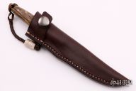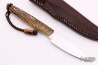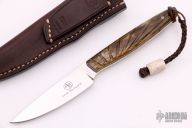 This "Bateleur" by Arno Bernard features a tumbled finished drop point blade with a notched thumbrest and a full tang construction. The handle features carved Giraffe Bone Scales. Includes a brown leather sheath. Comes with original box and papers. Excellent Condition.