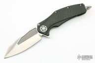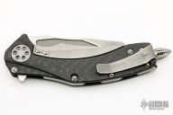 This Matrix flipper features a tri-tone blade with stonewashed grinds, satin flats, and bead blast cut-outs, flipper, and a notched thumbrest. The handle has a lightning strike carbon fiber frame with a titanium clip, tip up carry, and a titanium backspacer. Comes with zippered case. Dated 08/2015. Has some scratches, has been resharpened, needs to be sharpened, good condition otherwise.