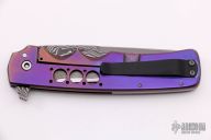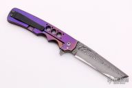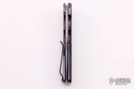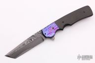 This Tanto flipper by Jason Clark features a Chad Nichols San Mai Armor Core Damascus blade with a checkered flipper. The handle has a dovetailed timascus bolster, carbon fiber scale, orange peel finished and anodized titanium frame, San Mai Damascus backspacer and a black cerakote titanium tip up clip. Rides on IKBS, nice detent, lockup and blade seating. Comes with a zippered case and COA dated 9/29/15. Excellent condition.