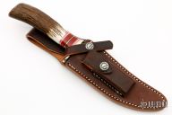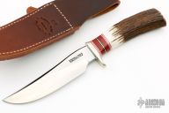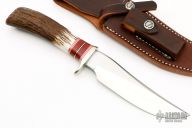 The Model 27 is an ideal all-around heavy-duty sportsman's knife. This knife has a satin finished blade, .220" blade stock and 1.360" blade depth, hidden tang construction. The handle has a nickel silver guard, and stag handle with red, duralumin, white, red linen micarta, black and brass spacers, and a nickel silver butt plate. Comes with a brown leather sheath and original paper wrapping. New from maker.