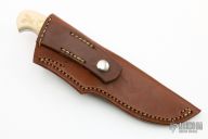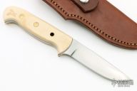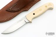 This Haynes Hole Hunter features a hand rubbed satin finished blade, .189" blade stock and 1.018" blade depth, full tang construction. The handle has ivory micarta scales with black liners and brass pins. Unique pin lock on sheath puts pin through handle hole for positive lock, called "Haynes Hole". Has double eagle etchings on both sides of handle. Comes with a waxed brown leather sheath signed "J Haynes 2004 #24/25". Has a few light scratches, otherwise excellent condition.