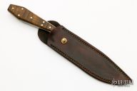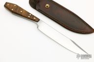 This Coffin Handle Bowie by Paul Cooper features a hand forged hand rub satin finished blade with sharpened clip, .225" blade stock and 1.118" blade depth, full tapered tang construction. The handle has curly maple scales with brass pins. The tang and blade spine are nicely rounded and the tang has an heirloom fit up with the tang being proud of the scales. Comes with a brown leather sheath with brass belt stud. New from maker.