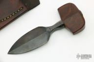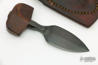 This Push Dagger by Paul Cooper features a gun blued double edged hand forged blade with .150" blade stock and 1.058" blade depth, hidden tang construction with a desert ironwood burl grip. Comes with a brown leather sheath. New from maker.