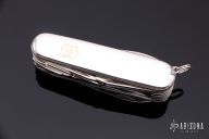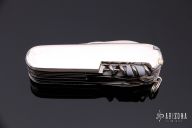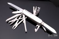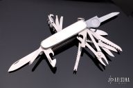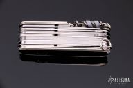 This large Swiss Army knife has been customized by Tiffany & Co. with sterling silver covers. Comes with a cloth Tiffany & Co. bag, original box and a Tiffany & Co. gift bag, also comes with original sales receipt dated January 30th, 1997. Excellent condition. Large blade Small Blade File Small Saw Large Saw Ruler Fish Scaler Scissors Pliers with Wire cutter/stripper Magnifying Glass Phillips Head Small Flat Head Large Flat Head Can Opener Bottle Opener Toothpick Tweezers Pen Auger Baggage Hook Cork Screw Tiny Flat Head