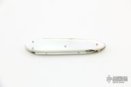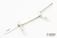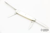 This Vintage Slipjoint by D. Peres Solingen Germany features 3 mirror polished blades with nail nicks and a nail file on the spine with a mother of pearl inlay. The handle has mother of pearl covers with nickel silver pins and steel springs. Has some light scratches and some oxidation on the springs, otherwise excellent condition for its age. Very classy and useful little pocket knife. Both of the pen blades is marked "D.R.G.M." and "GERMANY" on the other side. The main blade is marked "D. Peres Solingen Germany" on one side and has a picture of a barrel on the other side.