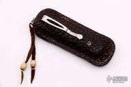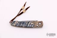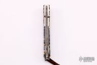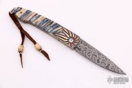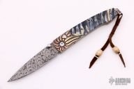 The B10 Sunburst by William Henry features a Damascus blade with single thumbstud with Diamond inset in gold bezel. The frame is carved stainless steel and titanium with 22kt gold inlays, Mammoth Molar scales, Diamond set in gold bezel the button. The piece exudes a sophisticated elegance sure to please any owner. Includes wooden presentation box, leather pouch, and all paperwork. Excellent condition.