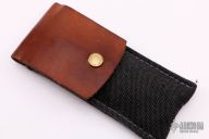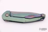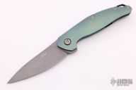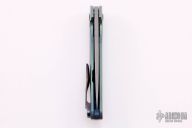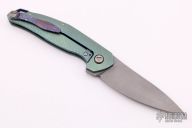 This Neo flipper by Jens Anso features a tumble finished blade with notched flipper. The handle has a fine, checker milled andanodized titanium frame, anodized titanium backspacer with lanyard hole and Mokuti pocket clip that is positioned for tip up carry. This piece has a stainless steel lockbar insert and over travel stop. Rides on bearings. Nice detent, lockup and blade seating. This is a stunning example of Mr. Anso's talent. Comes with original pouch and box. Excellent condition.