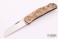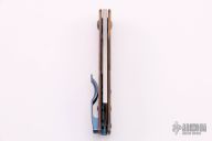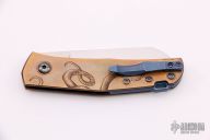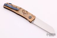 This Monte Carlo by Jens Anso features hand rub satin finished sheepsfoot style blade with nail nick. The handle is comprised of copper scales over dual inlaid liners with double detent that provides a crisp click in the open, closed and half stop positions. Engraved by Artbyrafn. Anodized backspacer with lanyard bail and tip up clip. Includes felt slip case. Excellent condition.
