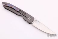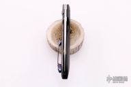 This Anchovy by Kevin Foster features a hand rub satin finished blade with thumbhole. The handle has a carbon fiber and bead blasted titanium frame, tip up black Timascus clip and a carbon fiber backspacer. Gold lip pearl inlaid into the pivot. Nice detent, lockup and blade seating. Comes with cloth pouch. Excellent Condition.
