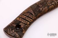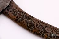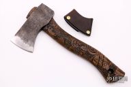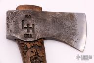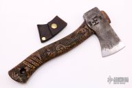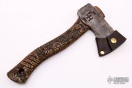 These custom 12" camp axes are a collaboration between Hoffman Blacksmithing and Brett @Smuglabs. Each axe was hand forged by Liam Hoffman from a block of 4140 chromium molybdenum alloy steel in North Carolina, USA! Hung on a straight grain hickory handle that has been carefully laser engraved by Brett @Smuglabs using a design that he created for this project. The back poll is hardened and tempered so it can be used as a proper hammer. Comes shaving sharp, and is excellent to use around the camp site. Sheaths are hand made with thick vegetable tanned cowhide and snaps. Excellent condition. Only seven of these were made.