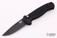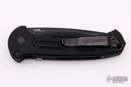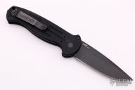 This 9051 AFO II auto from Benchmade has a black spear point blade with false top edge. Black anodized aluminum handle. Integrated safety system. Black stainless steel clip - 4 way reversible, and lanyard hole. Has some scuffs on the blade and frame, otherwise good condition. Comes with original box sheath and papers.